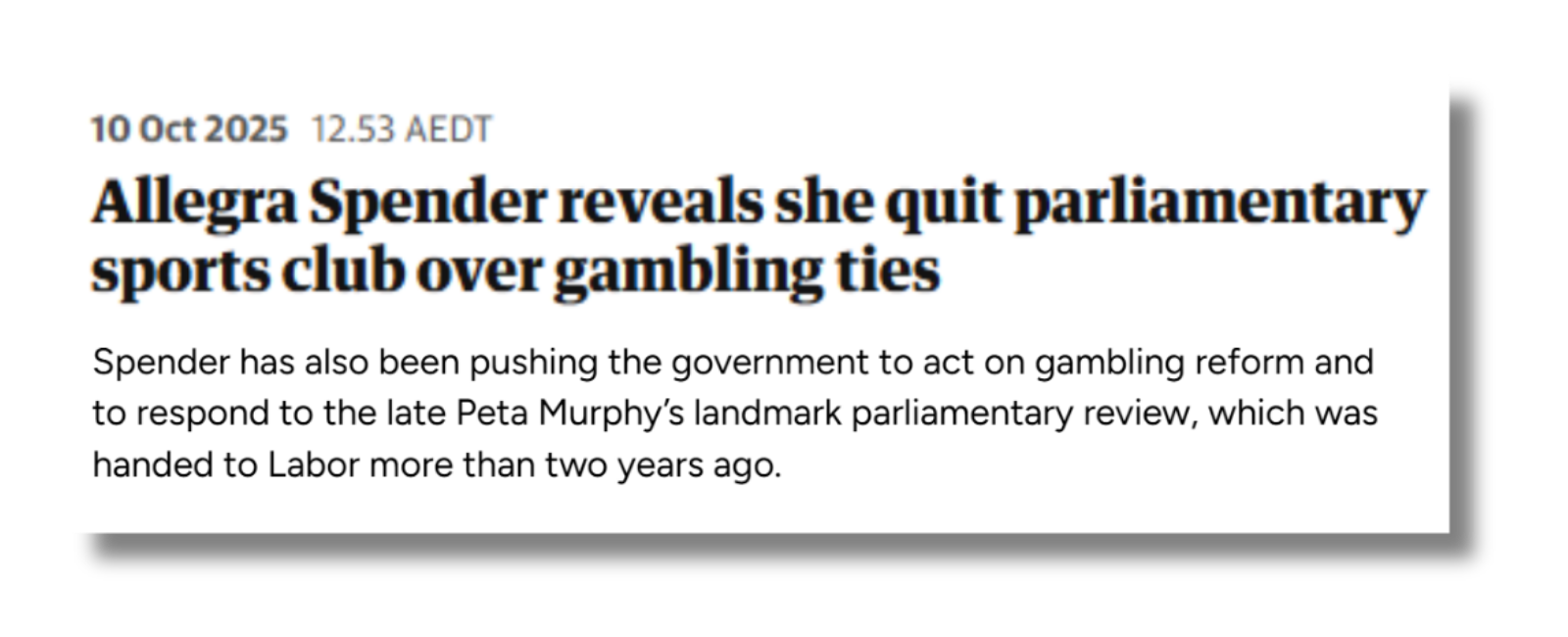 Earlier this month I resigned from the Parliamentary Sports Club – which the Prime Minister is president of - when it became clear it was being sponsored by the gambling lobby. In the last sitting week, I was glad to attend a panel on gambling harm hosted by David Pocock and Kate Chaney and will continue working with the crossbench on this issue.