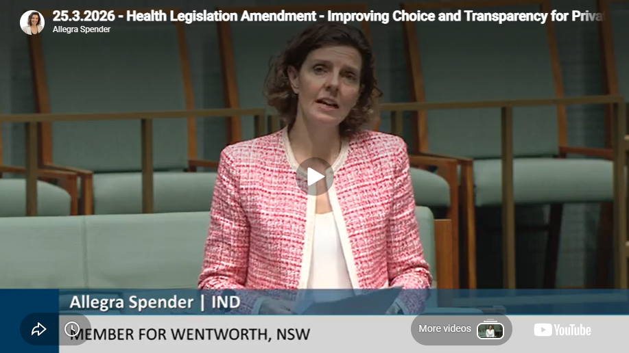 Ms SPENDER(Wentworth) (17:57): I rise to support the Health Legislation Amendment (Improving Choice and Transparency for Private Health Consumers) Bill 2026. One of the things Australians are most proud of is our healthcare system. We value a system that ensures everyone can access the care they need through Medicare, through bulk-billing and through a network of high-quality public hospitals delivering world-class treatment. But Australia has many other aspects to its incredible Medicare system, and this bill deals with two that are of critical importance—the private health insurance part of the healthcare system, and our specialists.